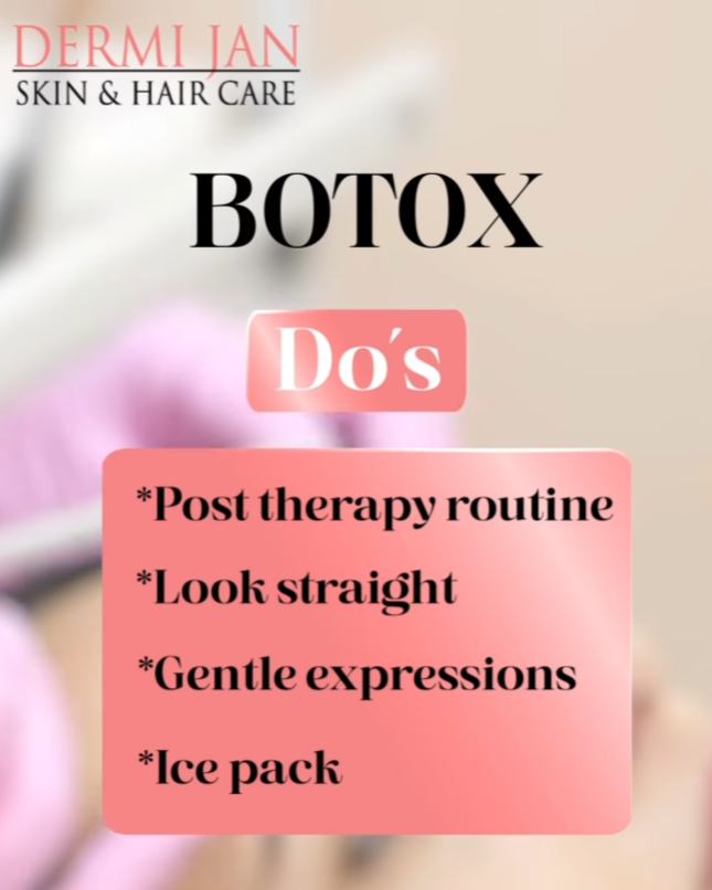 Botox Treatment in T Nagar Botox Post-Therapy Do’s & Don'ts! Stay fresh, natural & flawless after your session *Look straight & keep gentle expressions *Use an ice pack for comfort *Maintain proper posture